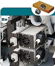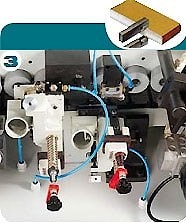Клеевая ванночка является достаточно вместительной (4 л), что позволит избежать частого пополнения клеем бочка. Ванночка для клея-расплава разработана таким образом, что перегрев клея полностью исключен. Этому способствует электронный контроль клея и автоматическое снижения его температуры. Предварительная обрезка излишней кромки осуществляется двумя гильотинными ножницами, одни из них предназначены для кромки от 0,4 до 1 мм толщиной с автоматическим возвратом кромки, другие более жесткие ножницы- для ПВХ И ABS до 3 мм. Важной особенностью станка, как было упомянуто выше, является наличие в нем дополнительных узлов.
