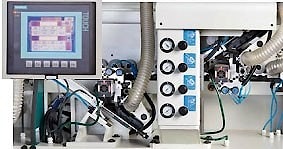 Узлами финишной обработки станка являются торцовочный, циклевочный, полировальный узлы, узел снятия свесов и обкатки. Циклевочный узел необходим для устранения видимых следов клея на кромке. Торцовочный узел удаляет излишки кромки, оставшейся после обрезки гильотинными ножницами. При помощи узла для снятия свесов осуществляется удаление кромки по пласти. Для радиусных торцов столешниц, постформинга и прямолинейных торцов используется узел обкатки углов, который производит обкатку в начале и в конце заготовки. В данной модели станка он контролируется с помощью PLC SIEMENS с позиционированием типа включить/ выключить.